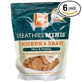 BREATHIES Chicken Breast Minis are made with 100% all-natural, cage-free chicken breast and fortified with mint and parsley for fresh breath and healthy teeth. These bite-size pieces are perfect for puppies or small dogs, and are perfect for training. They are rich in protein, digestible and low in fat and sodium.