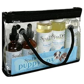 pure botanical puppy care spa set. All Natural Ingredients. Complete daily set for puppy care. Puppy Shampoo-conditioining spray assortment-ear and breath care. Effective products gentle for daily use for puppies-reuseable tote-gift.